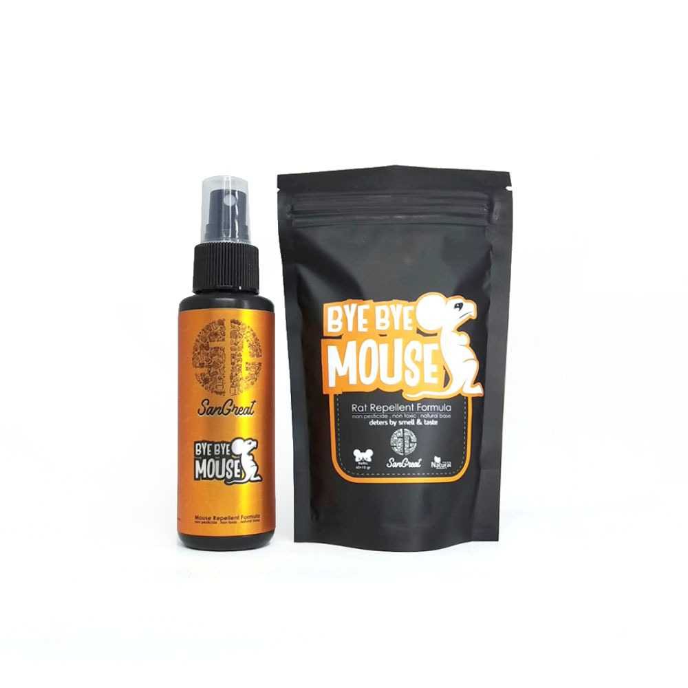 Paket BYE BYE MOUSESpray Isi = 100 ml.Gel 100 gramDeskripsi produk :Bye Bye Mouse (BBM) adalah essensial oil yang diformulasikan khusus sebagai repellent tikus.Sebagian besar tikus tidak suka wangi Bye Bye Mouse. Sehingga tikus akan pergi dari tempat yg tercium wangi Bye Bye Mouse.Bye Bye Mouse bukan racun sehingga tidak akan membuat tikus mati.Fungsi BBM :Memecah teritori tikusMengusir tikus tanpa membunuhMencegah tikus mendekati atau memasuki areal tertentu (rat repellent)Cara pakai:Bye Bye Mouse Spray1 . Semprotkan Bye Bye Mouse spray ke tempat yang sering dilalui tikus atau persembunyian tikus2. Sebaiknya disemprotkan menjelang malam, saat tikus beraktifitas.2.Semakin sering disemprot pada area yg sering dilalui tikus atau persembunyian tikus semakin membuat tikus enggan lagi bersembunyi di area tersebutCara Pakai Bye Bye Mouse gelCara pakai:1. Bersihkan area rumah dari bekas kotoran tikus dan barang-barang yang mudah dijadikan sarang tikus.2. Sebarkan beberapa gel Bye Bye Mouse ke tempat yang diperlukan dengan jarak 5-10 cm.3. Sesuaikan jumlah gel yang disebar dengan luas area, semakin banyak gel yang disebar akan semakin efektif.4.Gel Bye Bye Mouse akan mengering setelah 2-3 hari.5. Untuk memberikan efek yang lama, gel Bye Bye Mouse dapat disebarkan kembali setelah gel sebelumnya mengering.6. Sebarkan Bye Bye Mouse 2-3 kali aplikasi untuk memecah teritori tikusWarning: efek Bye Bye Mouse mungkin tidak sama untuk setiap ti