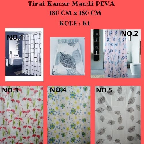Tirai Kamar Mandi Anti AirTirai dengan motif cantik, Bahan Anti Air, khusus untuk kamar mandi.- Flower- Dolphin- Flamingo- Bath Time- Foot Print- Cute Cat- Kotak-Kotak- Red Tree- B&W Square- Blue Butterflyukuran 180cm x 180Bahan : Peva (Plastik) = polyethylene vinyl acetate / nontoxic and PVC-freeBahan PEVA digunakan untuk semua Shower Curtain.Manfaat :-Dapat Menahan Air Bercipratan Kemana-Mana-Kamar mandi jadi bersih dan rapi.Bahan Tebal dan halus jadi tidak akan mudah robek.Sudah dilengkapi hook/pengait (tidak berikut tiang gantungan). Tiang gantungan ada dijual bebas di pas