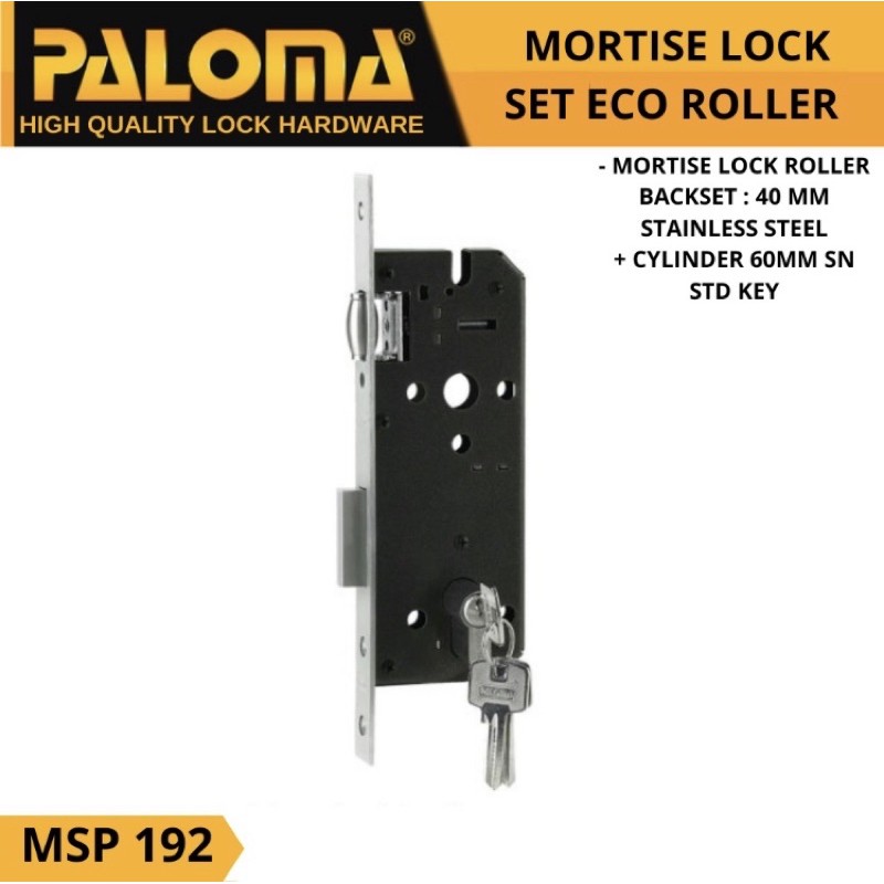 Product Description : MORTISE LOCK SET PALOMA STD ROLLER 40MM+CYLINDER SNKeterangan Body Kunci MLP 192 ( STAINLESS STEEL 201)- Medium duty mortise lock.- For moderate frequency of use such as for doors in residential properties.- Suitable for wooden door mass up to 100kg.- 5 Years Mechanical Warranty.- Designed according to European standards.Backset : 40mm.Mechanical : Medium duty internal mechanism.Latchbolt : Stainless Steel. Reversible. Cylinder activated.Deadbolt : Stainless Steel . Double throw.Faceplate : Stainless Steel.Strikeplate : Stainless Steel. Strikebox included.Casing : Stainless Steel, painted. Closed case.Spindle Hub : Stainless Steel. Square shaped.Keterangan Cylinder Kunci CLP 104 :- Medium duty, for moderate frequency of use such as for doors in residential buildings.- Galvanized body, rust and corrosion resistant.- Standard key on both sides.- 5 Years Mechanical Warranty.- Designed according to European standards.Shell & Plug : Zamak-3.Pin : Brass, 5 pins.Cam : Hardened steel.Key : Brass standard-key, nickel plated. 3 keys included.Harga Tertera Adalah Harga Per