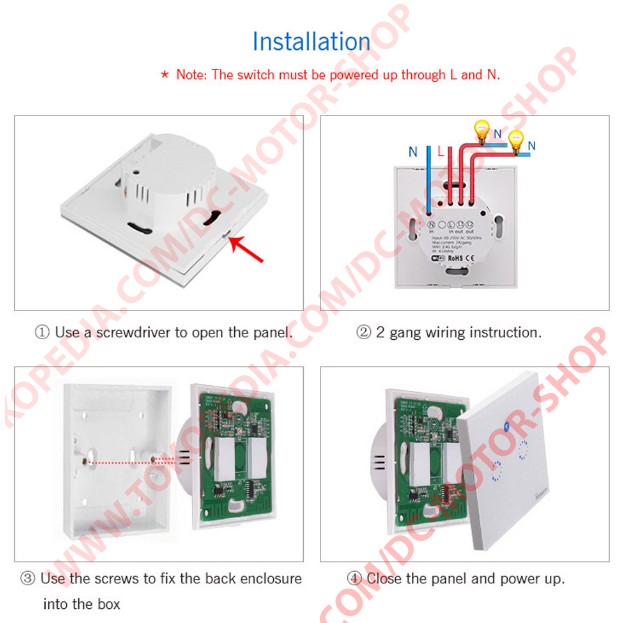 Video Tutorial: Untuk Sonoff T1 3 Gang: Remote RF dapat di beli disini: Inbow: Product Overview:- The Sonoff T1 EU Wall Touch Switch series are 2 gang 86 type touch/App/ RF control luxury smart light switch. - The wireless wall switch can be added to iOS/Android App eWeLink via WiFi, - allowing users to remotely turn on/off connected lights or appliances separately from anywhere at any time.- After successfully learning codes with 433MHz RF Remote, the touch light switch can be turneD on/off indoors. - Upgrade your home to an elegant smart home, control anywhere, anytime!- With the App eWeLink, you can create scheduled / countdown timers to auto-turn on/off devices at the specified time. - You can also create scenes to turn on/off all the devices in your house with one tap. - The smart wall switch works perfectly with Amazon Alexa, you can ask Alexa to turn it on/off.Product Specification:Power Supply: 90V-250V ACMax. Current: 2A/250V/gangMax. Power: 600W/gangWireless Standard: WiFi 2.4GHz & 433MHz RFMaterial: ABS V0+ Toughened Glass PanelDimension: 86mm*86mmProduct Advantage:Touch ON/OFF.App Remote ON/OFF.433MHz RF Remote ON/OFF.Scheduled/Countdown Timers.Works With Nest.Works With Alexa.Works With Google Home. barang tersedia boss , langsung dipesan , akan segera kami p