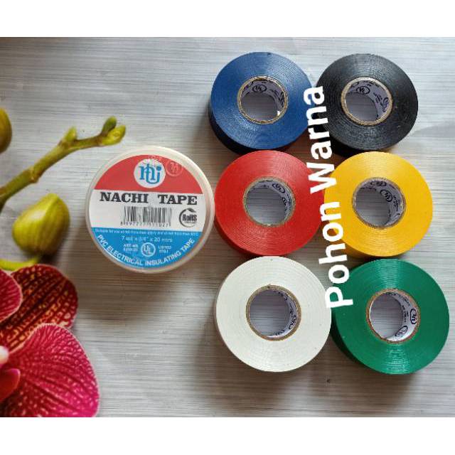 pvc electrical tape merk NACHI : (tersedia 6 macam warna )-Lebar : 19mm / 1,9cm.-Panjang : 20meter.-Warna : Hitam / Black. Merah / Red. Putih / White. Kuning / Yellow. Hijau / Green. Biru / Blue.#pvc #nachi #national #listrik #isolasi #lakban #daimaru #unibel #3m #murah #kabel #elek