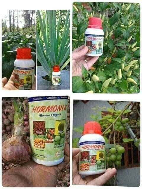ready kemasan 100 cc dan 500 cc bisa cari di etalase kami yaHormonik merupakan produk hormon yang bersifat organik dengan senyawa alami Zat Pengatur Tumbuh (ZPT) yang dapat mengatur pertumbuhan tanaman.Manfaat :Mempercepat proses pertumbuhan pada tanaman dan akar.Memperbesar dan memperbanyak umbi.Mengurangi kerontokan pada bunga dan buah.Memperbesar dan memperbanyak buah.Meningkatkan keawetan hasil panen.Memacu dan meningkatkan bobot hewan ternak.Cara Penggunaan :Kocok dahulu sebelum digunakan.Dosis : 1-2 cc HORMONIK per 1 liter air.Penggunaan lebih optimal jika dicampur dengan POC Nasa (dosis 1 tutup Hormonik + 3 tutup POC Nasa) per tangki.Penggunaan dengan cara disemprotkan terutama pada daun tanaman hingga merata.Tanaman semusim: misal pertengahan usia tanaman hingga menjelang reproduksi, yaitu sebelum berbunga/ berumbi (3-6 kali semprot). Penggunaan semenjak awal tanam lebih baik.Tanaman tahunan : 2-4 bulan sebelum berbunga/berbuah (3-6 kali semprot).Unggas : 1-2 tutup Hormonik + 1 botol (500 cc) POC Nasa / Viterna Plus, kemudian 1-2 cc dari campuran tersebut dilarutkan dalam 1 liter air minum diberikan ke unggas setiap hari 1 kali.#HOR