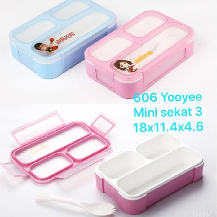 Grid Box | Grid Box 3 Sekat Mini | Yooyee Grid BoxDetail Produk Grid Box Yooyee Mini Lunch Box Kotak Makan 3 Sekat :Yooyee Kotak Makan Grid Bento Mini Lunch Box 3 Sekat Anti BocorWarna Ready : PINK & TOSCA Dimensi (PxLxT) = 18 x 11,5 x 4,6 cm (540ml)Type 606- Ditutupnya terdapat karet antar sekat, sehingga makanan tidak bercampur- Bahan plastik tebal BPA Free- Tahan panas sampai 120 degC- Dilengkapi sendokKelebihan:1. Terbuat dari bahan yang berkualitas untuk makanan, aman dan tidak membahayakan2. Tidak berbau plastik bahkan menggunakan air mendidih di dalamnya4. Bahan berkualitas yang tahan terhadap panas atau dingin5. Dapat digunakan untuk pemasanan menggunakan microwave, menyimpan pada kulkas, dan mesin cuci piring (Dishwasher)6. Tahan panas sampai 120 de